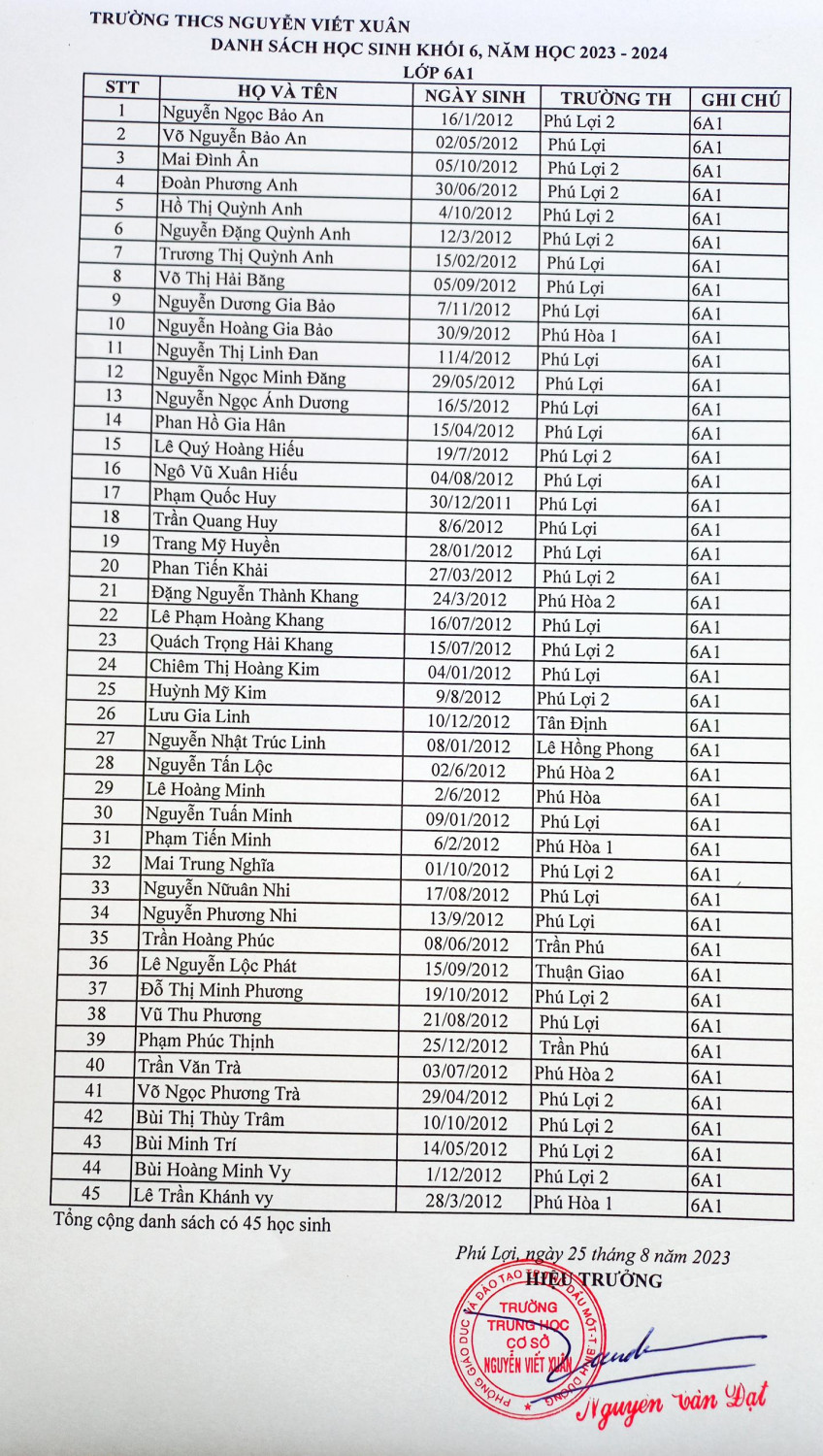 Ban giám hiệu thông báo danh sách khối 6, năm học 2023 - 2024. Nếu có thiếu tên hoặc sai thông thì Quý phụ huynh vui lòng nhắn tin qua zalo Thầy Khải (0927.585.540).